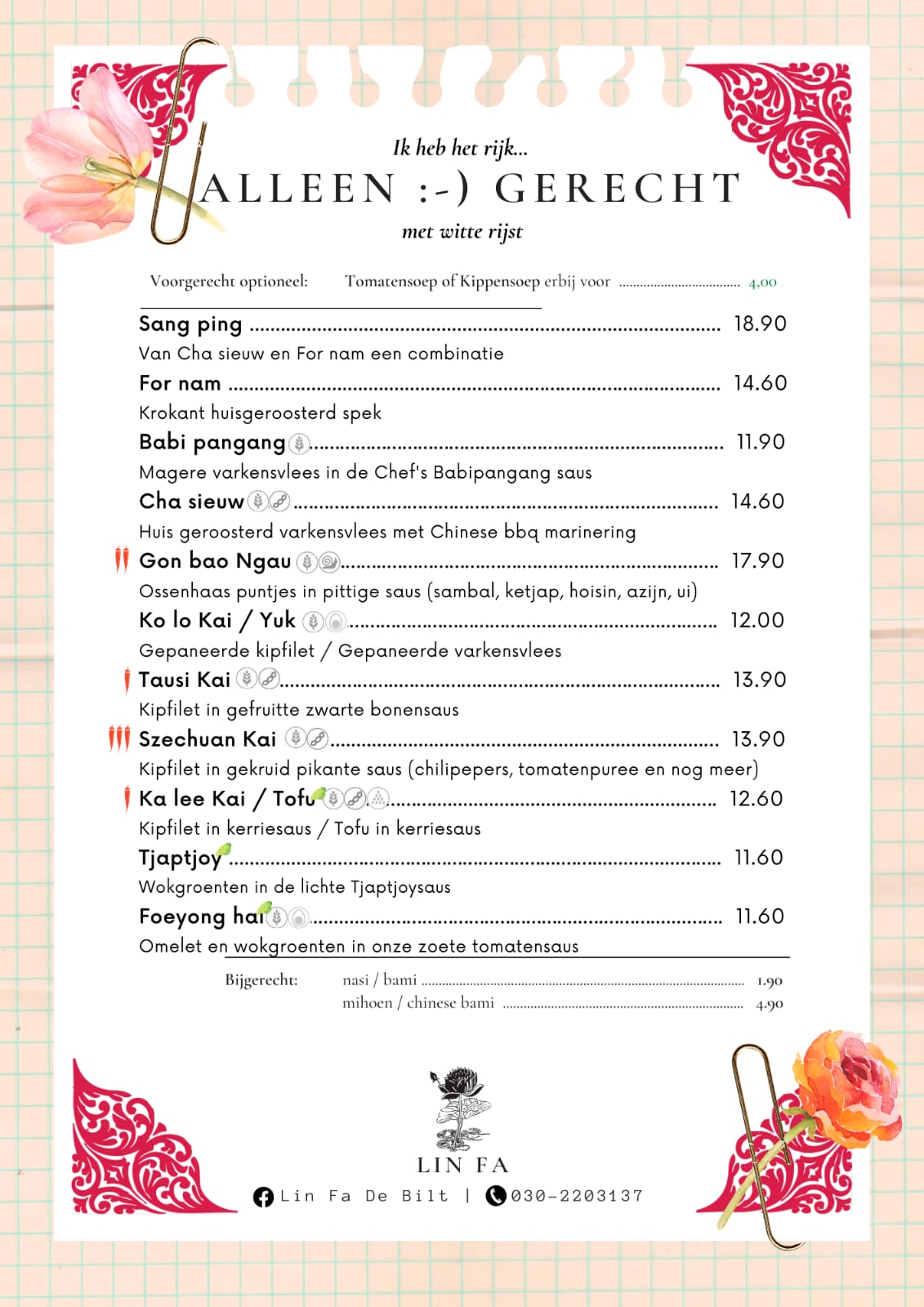 U vindt hier het actuele aanbod in het alleenmenu. Buiten de alleenmenu om kunt u ook een kijkje nemen bij het maandmenu, familiemenu en de volledige afhaallijst. Heeft u vragen of opmerkingen? Bel dan naar +31 (0)30 220 31 37.